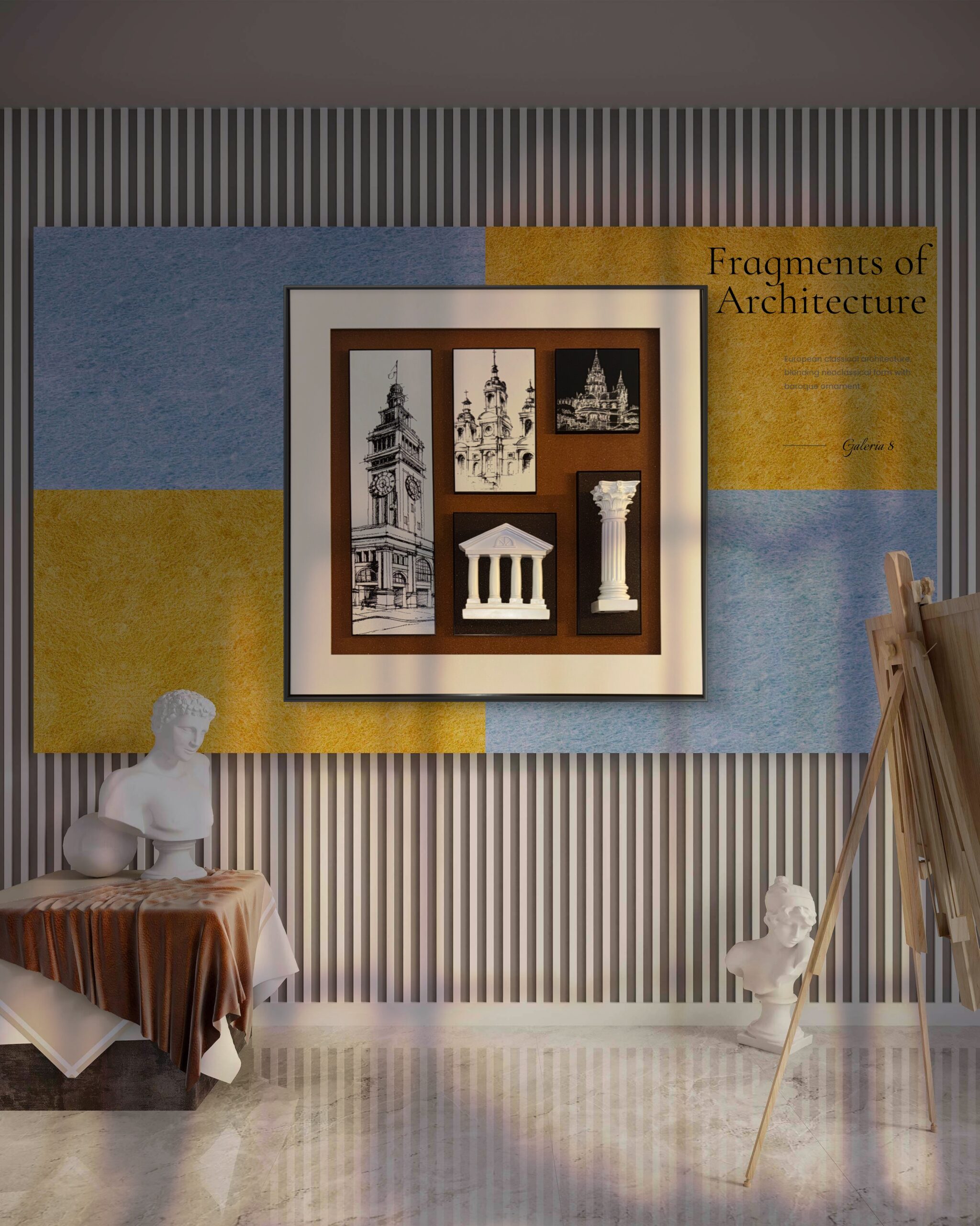 Fragments of Architecture is a curated composition bringing together architectural fragments, sculptural figurines, and graphic elements. Classical forms are reinterpreted through a modern lens, creating a layered dialogue between structure, history, and design. The interplay of image and relief adds depth and quiet sophistication to the piece.